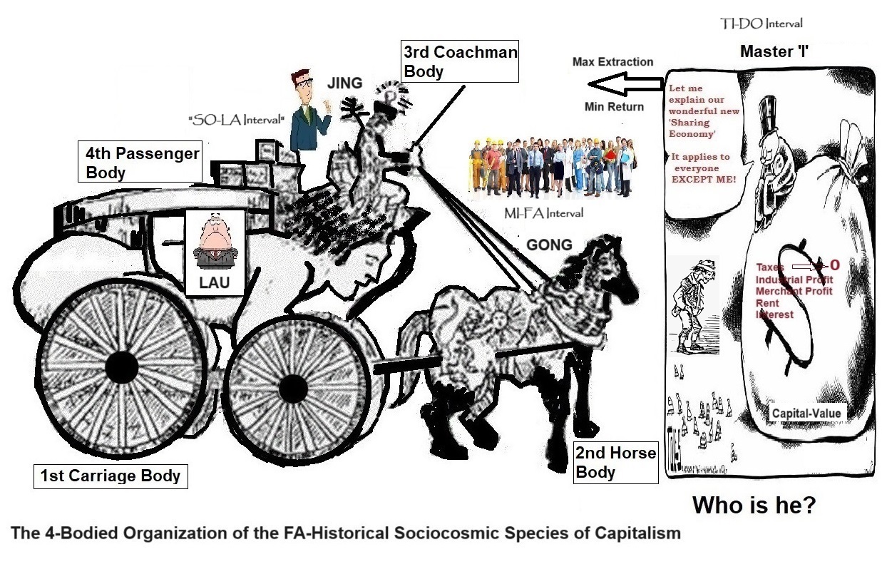 Financial Exchanges on Mobile Industrial Driencariage System (1st Carriage Body), Industrial Distribution System (2nd Horse Body), Financial System (3rd Coachman Body) and Ultimate Grand Global Monopoly Bureaucratic Capitalist Class (4th Passenger Body or Master 'I'?). Note: Capitalistic-essenced FA-Lau beings of the three-centered Corporates at MI-FA Interval are always hungry for Exclusive Ownership and/or Right (EOR) of Profit, Interest, Rent, Equity and Assets (PIREA), and those ill-fated FA-Gong beings they have NONE, EXCEPT the lowest Salaries and Wages. As to the FA-Jing beings they also have NONE, EXCEPT the higher if not the highest Salaries. As to the SO-Lau beings of the three-centered Nationates at TI-DO Interval they are always hungry for the maximization of quit rents of SO-Governance on land and building Assets within their EOR. As to the LA-Lau beings at this same TI-DO Interval, they are always hungry for the maximization of income tax of LA-Governance on both the FA-Jing and the FA-Gong beings in general and other income receiving three-brained individuals, minimization if not maximization of three-centered corporate tax within and/or outside national boundaries, taxes and/or duties on goods and services in trade and exchanges and for all "protection monies" from other nations and states. As to the TI-Lau beings at this same TI-DO Interval, they want to collect subscriptions and participation of the nations and states who have become members. As to the SO-Jing and SO-Gong beings, LA-Jing and LA-Gong beings and the TI-Jing and TI-Gong beings, they are just modern slaves in the Pyramidal Laujinggong Scheme. Finally, All these are functioning within the polar FA-SO-LA-TI Historical Periods of Capitalism and Socialism's historical timeline (before 2148 AD), and NOT of the Polar FA-SO-LA-TI Periods of Socialism and Communism's historical timeline (after 2148 AD) based on Astrological Age as reference. Such a happening for society and Humanity-at-Large is thus explained with clarity, and with understanding when the triad and octave laws together with sociocosmic octave and the sociocosmic enneagram methodologies are used. Note that these four capital-values are coated with the four physical bodies of the passenger-coachman-horse-carriage design and construct besides the 4 virtual psyche hydrogens created in each of them. The physical (or material) bodies are inseparable parts of the geobiosociotechnocosmic octaves as well as the natural geocosmic octaves. The Master 'I', being the Passenger controls the Coachman (Executive director, Managing director and CEO and the departmental managers) through the capitalistic-essenced noomakhian being-psyche hydrogens that are produced in abundance in the noosphere of FA-Historical Sociocosmic Species of Capitalism as well as a salary, allowance, director's fee, bonus, profit-sharing (often) and non-financial benefits design and construct; the Coachman controls the Horse (worker and employee) through a financial money flowing through the two reins in the form of wage and salary; and the Horse controls the Carriage through using its labor or energy from the three-being foods they eat. All the surpluses and accumulated corporate wealth belong to the capitalistic-essenced corporate Master 'I' or the corporate owners sitting at the top of the social pyramids of the FA-laujinggong carriages at the MI-FA Interval; and all governmental taxes (tariffs, import-export duties, rents, penalties, etc.) and accumulated capitalistic-essenced nationate wealth belong to the nationate Master 'I' or nationate trustees sitting at the top of the social pyramids of the SO-laujinggong carriages and the LA-laujinggong carriages - all to be siphoned to the benefits of the minority capitalistic class in a FA-Historical Sociocosmic Species of Capitalism. All the surpluses and accumulated worker cooperative or collectivistic wealth does not belong to any socialistic-essenced cooperative or collectivite trustee or owned by the beholders sitting not at the top of the right-standing social pyramids but rather sitting at the top of the inverted social pyramids of the the FA-gongjingdong carriages at the MI-FA Interval of the transitional SO-Historical Sociocosmic Species of Socialism; and all socialistic-essenced governmental taxes (tariffs, import-export duties, rents, penalties, etc.) and accumulated socionate wealth does not belong to the socionate leaders as they socialistic-essenced trustees sitting at the top of the inverted social pyramids of the SO-gongjingdong carriages and the LA-gongjingdong carriages - all to be distributed with HEIGRENS to the benefits of the majority or people in general a SO-Historical Sociocosmic Species of Capitalism. This hegemon sociocosmic rascal madcap self-proclaimed Master 'I' together with his lau beings sitting on paper and electronic infinite digital molehill of monies are the parasites who kill their own hosts gradually! Mega-land, marine and avian military wastrel assets and wastrel nuclear arsenals especially are regularly exhibited by this madcap naive Master 'I' (1%) that He could destroy His own other 3 sociotechnocosmic bodies (99%) below Him forgetting that 'He kills Himself' during the destruction of His Ownself, and produces large quantity of low quality sacred askokin for lunar extraction during His terrible terrible rascooarno process of Himself. The sociocosmic rascal Master 'I' believes in only One-God and One-God religion of Himself, and scratching His heads wondering why there are many more master 'I's, 'I's and even 'it's or many gods itching obfuscatedly all over His own 4-sociocosmic bodies and even inner wish that His own self-trialectical leaping of Himself as a FA-Historical Sociocosmic Species of Capitalism into Himself as a SO-Historical Sociocosmic Species of Socialism - reborn unscathed during its own final metamorphosis. At this 4th metamorphosis stage, Finance, Insurance, Real Estates and Digital Inf