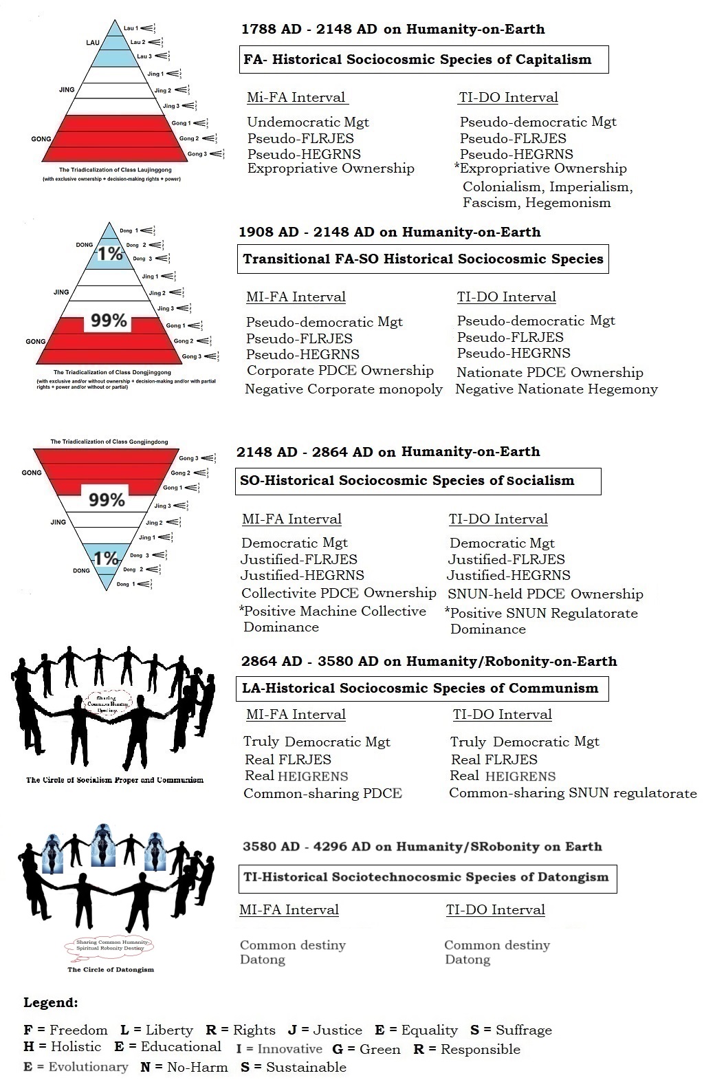 Octave." "Whereas being-socialism of China is a 'socialism with Chinese Characteristics' would be a SO-Historical Sociocosmic Species of Socialism in the Standard Sociocosmic Octave or a FA-Historical Sociocosmic Specie-Stopinder of Socialism in the mainstream Fundamental Natural Historical Sociocosmic Specie-Stopinders Octave both based on the Dongjinggong/Gongjingdong triadic modes and means of PDCE, and the 'Chinese characteristics' would be as big as to embrace the whole collective four-bodied NOO-HEIGRENS(+)-PDCE Carriage of the Sinic (Chinese) civilizational womb itself, and which is also changing in time; being-capitalism of the United States of America could be understood in this same methodology as a 'Capitalism with American Characteristics' and would be a FA-Historical Sociocosmic Species of Capitalism in the Standard Sociocosmic Octave or a Mi-Capitalism, Fa-Colonialism, So-Imperialism, La-Fascism (Nazism inclusive) and Ti-Hegemonism as the last five (5) 1st lateral stopinders of the MI-FA Interval of the Natural Historical Sociocosmic Specie-Stopinders Octave all based on the laujinggong triadic mode and means of PDCE, and an 'American characteristics' that would also be as big as to embrace the whole four-bodied NOO-PESTLES(+)-PDCE Carriage of the Anglo-Saxon (Western) civilizational womb itself, the original source of its arising, which is also changing in time. "The UGGMBCC (1%) has its source of origin as corporate stopinders dwelling at the MI-FA Interval; it must eat vertically the nationate stopinders dwelling at the TI-DO Interval above and the personate stopinders dwelling below it as well as the other corporate stopinders of the MI-FA Intervals within and without horizontally. It has to be the only exceptional one sitting on top of all social pyramids in the world." "Since its birth in the 1533 AD in Great Britain, capitalism started stealing everything from everywhere in the world, and got the loot officially registered legally in its own constitution to the ownership or rightful usage of the thieves. Then more and more thieves were born after learning the trick. If 'stealing' is the uncomfortable word, 'unequal buying & selling' would be the better phrase to qualify a long-term wealth accumulation process. It is a long historical process of about 500 years which ultimately creates a global 10% (moving to 1%) minority becoming the haves and 90% (moving to 99%) majority becoming the have-nots."