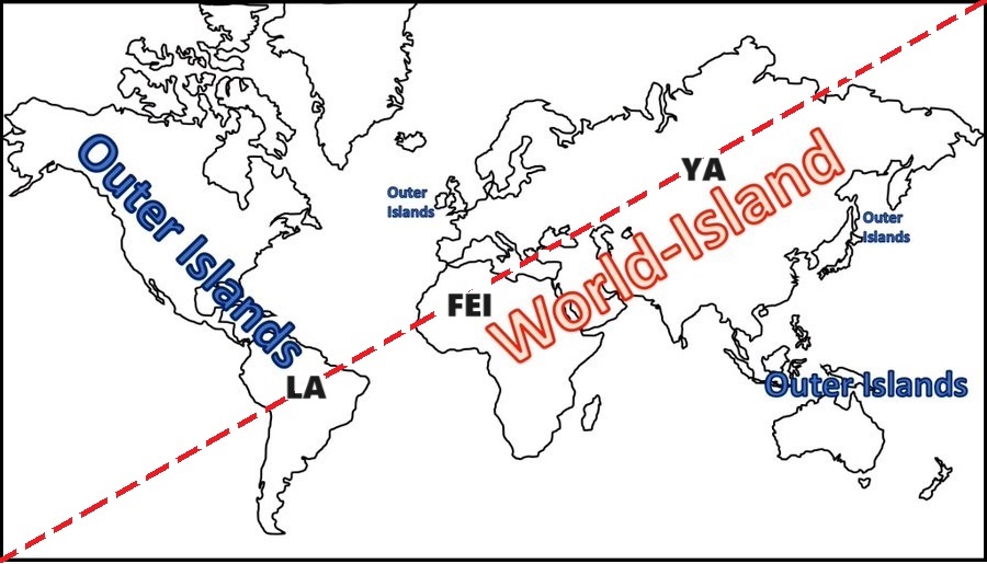The World-Island YAFEILA and Outer Islands Crescent map showing the Sinic Socio-cultural Civilization NOO-PESTLES(+)-PDCE Carriage concentric housing a SO-Historical Sociocosmic Species of Socialism being located in China of World-Island and an opposing Westphalian Technological-Security-Offense Imperialist-Militarist Civilization NOO-PESTLES(+)-PDCE Carriage concentric housing a FA-Historical Sociocosmic Species of Capitalism being located in North America of Outer Islands. There is also a once powerful World-Island USSR, now Russian Slavic Civilization NOO-PESTLES(+)-PDCE Carriage of a once descended or fell (due to been knifed to near death by imposed privatization and neoliberalism imported from the Wolf-sheepskin bosses of the Westphalian "civilization") SO-Historical Sociocosmic Species of Socialism into a FA-Historical Sociocosmic Species of Capitalism, but now ascending or rising to its original SO-Historical Sociocosmic Species of Socialism again after experiencing the 'terror-of-the-situation,' whipped and caned, and injuries-inflicted previously worsened by the overdosed shock therapy toxins injected by the soft powers from the Westphalian "civilization" to this unfortunate Slavic civilization for the partition, extraction and exploitation of its wealth by the mega-corporate and nationate laujinggong beings dwelling in Westphalian "civilization." Every one of these three NOO-PESTLES(+)-PDCE Carriage concentric depicted in the diagram is a gravity-center civilization that reverberates its influences all over World-Island and all the Outer Islands big and small. However, the World-Island and its Outer Islands Crescent is a FA-pangeacosmic stopinder, the Presente of the Historical Pangeacosmic Octave, and more such big and small gravity-centers would emerge in the future.