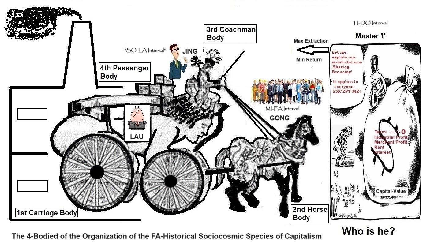 Immobilia social relations of production during the polar FA-SO-LA-TI Historical Periods of Capitalism and Socialism 1 The ‘horse’ means the emotions in the physical body from which is also the source of motor power. The horse must change. To change it needs a new language not just the mantras developed in the Piscean Astrological Age but of the healing language (and mantras) of an Aquarian Age. The difference between the two Piscean languages (and mantras) and Aquarian languages (and mantras) is that the former is perfected by a higher feeling center without the perfection of matured development of the higher thinking center (of Great Scientific Knowledge and Real Materialism) while the latter is perfected by a higher thinking center with the perfection of a matured and developed feeling center as well. The latter has Objective Reasoning and therefore also being able to be objective to consciousness, love, faith, belief, hope and conscience. This is the real Aquarian understanding in contradistinction to earlier less developed Piscean “understanding” without objective knowledge. Objective Reasoning cannot be acquired or perfected without much thinking and deep reflection or without what we called the western scientific knowledge which took a millennium to developed like higher feeling. The ‘shafts’ between the emotional part and the physical part expands on a hot day increasing more blood flow whilst the ‘reins’ between the intellectual part and the emotional part contracts on such a day and decreasing the level of consciousness. During a cold day the shafts contract restricting blood flow whilst reins expand increasing consciousness and conscious presence in the body as a whole. The intellectual part therefore has the least power of control over the emotional part and the emotional part has the greater ease of transmission of forces to the physical part on such a hot day. As with the horse which runs very fast that our poor coachman really must establish a special ‘language’ to it so as to control it. Our emotion which vibrates at enormous speed requires this mantra language device to control it. Blood is for perfecting the physical body. Blood becomes acidic due to the increase of Co2 level when body overworks; rest and deep breathing reduces the Co2 level and the blood becomes oxygenated, less acidic; therefore, less toxic and less harmful to the body. Hanbledzoin is for perfecting the feeling body. Head must control thorax and not thorax controls the head. Hanbledzoin is ‘reins’ connecting the brains in the head to solar plexus in the thorax. Blood is the ‘shafts’ connecting mainly the solar plexus in the thorax to the physical body as a whole including the head. Add feelings into the mental processes to lubricate them. Add reason into the feeling processes to give direction to them. Brains need hanbledzoin and body Kesdjan needs blood and hormone. Karnak is the physical body. The passenger or master has a way to communicate with the driver and that is by a ‘special language’ or ‘voice’ from an inner language source (your own inner source, your ‘I AM’) or from an outside language source (your outside source, your boss ‘LAU’) or a hybrid ‘inner-outside-outside-inner’ voice source (Union of ‘I AM’-‘LAU’). Passengers and masters need telecommunication devices to do the instruction work. The hackney-carriage harnessed to the horse, controlled by the coachman and taking instruction from the passenger is further objectively enveloped in the real world as the physical body of an organization in the workplace harnessed to the gong-workers, controlled by the jing-managers and taking instructions from the lau-boss with the capitalistic essence of asset accumulation and profit-seeking peculiar to contemporary capitalist mode of production during FA-Historical Period of Capitalism. In the previous feudal mode of production during the past MI-Historical Period of Feudalism, whole hackney-carriage is objectively enveloped as the physical body of a farmland workplace harnessed to the nong-peasants/serfs, controlled by the kong-fiefs and taking orders from the di-landlord with the feudalistic essence of land-asset accumulation and rent-tax and/or surplus produce collection. The craftsmen apprentice stationed at the workplaces and towns were harnessed by the kong-guilds to the feudal government. Today, we are still in this Pisces-Aquarius Transition Period, historically in the polar FA-SO-LA-TI Historical Period of Capitalism and Socialism infected by the sociocosmic diseases of neoliberalism.